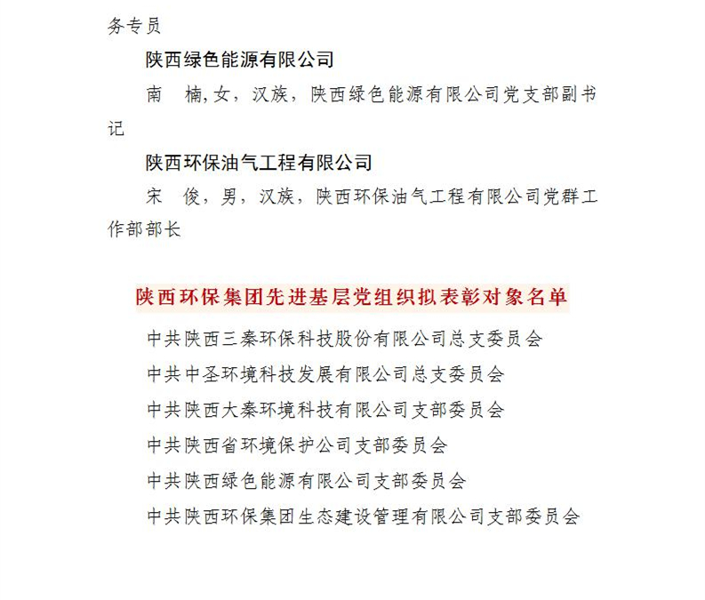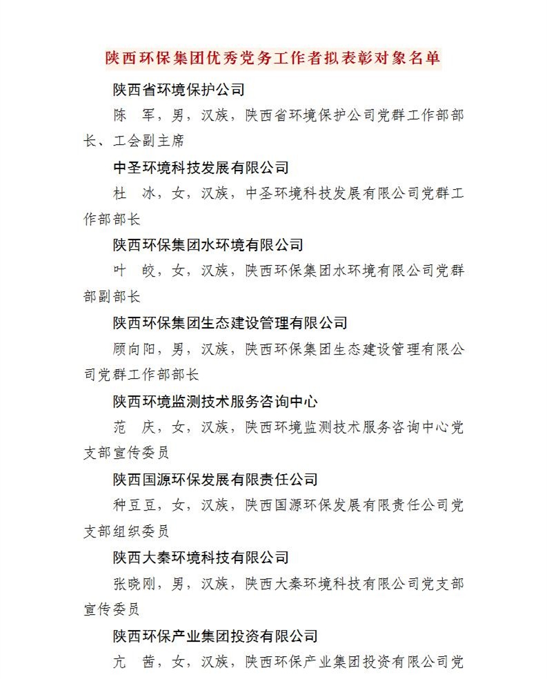 陜西環(huán)保集團(tuán)關(guān)于“兩優(yōu)一先”擬表彰對象的公示